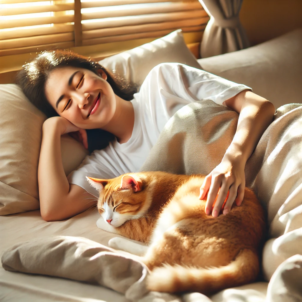 고양이가 침대 위에서 편안하게 있는 꿈은 평온함과 안정을 의미합니다.
