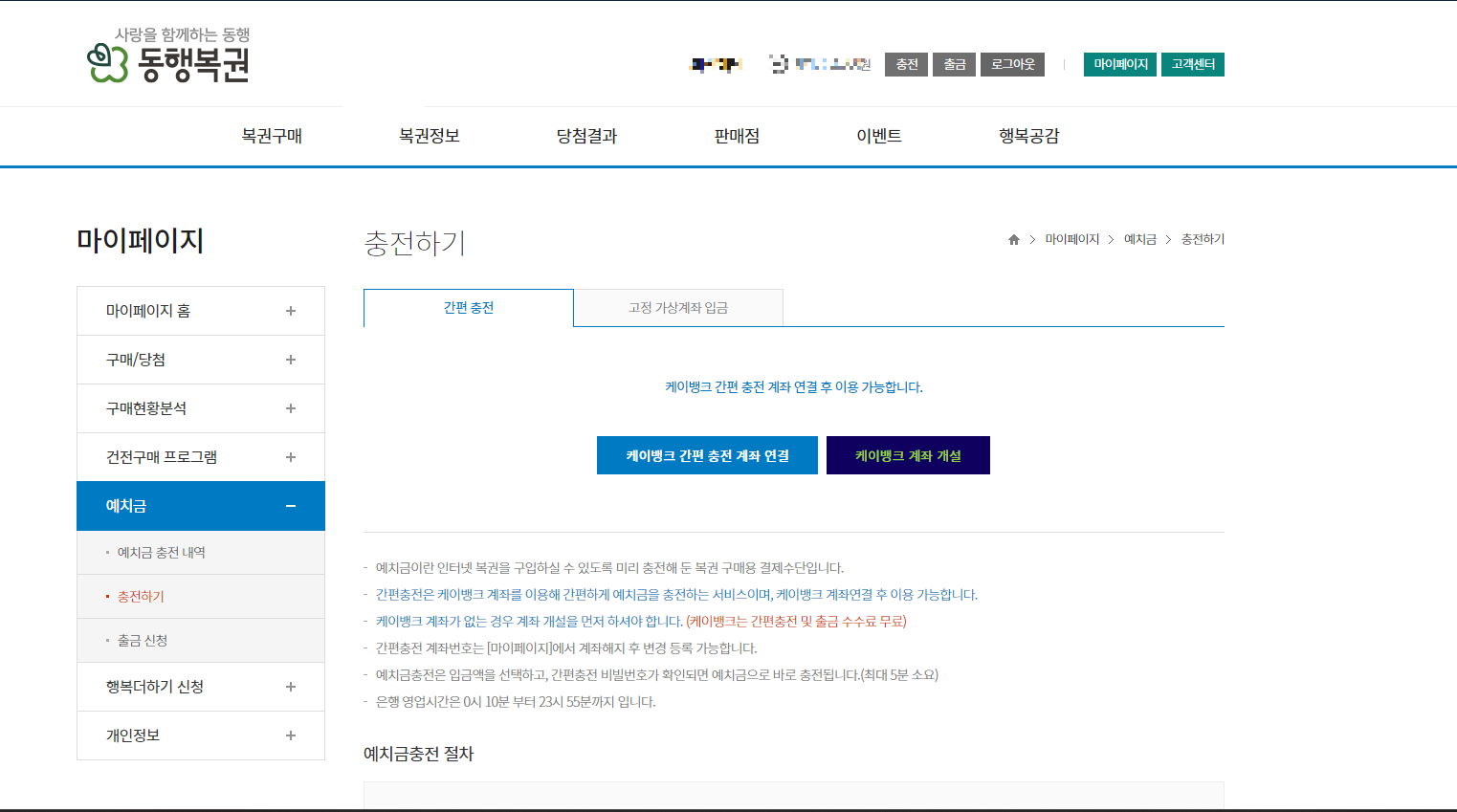 - 정보옆 충전 클릭 , 마이페이지 예치금 >> 충전 클릭